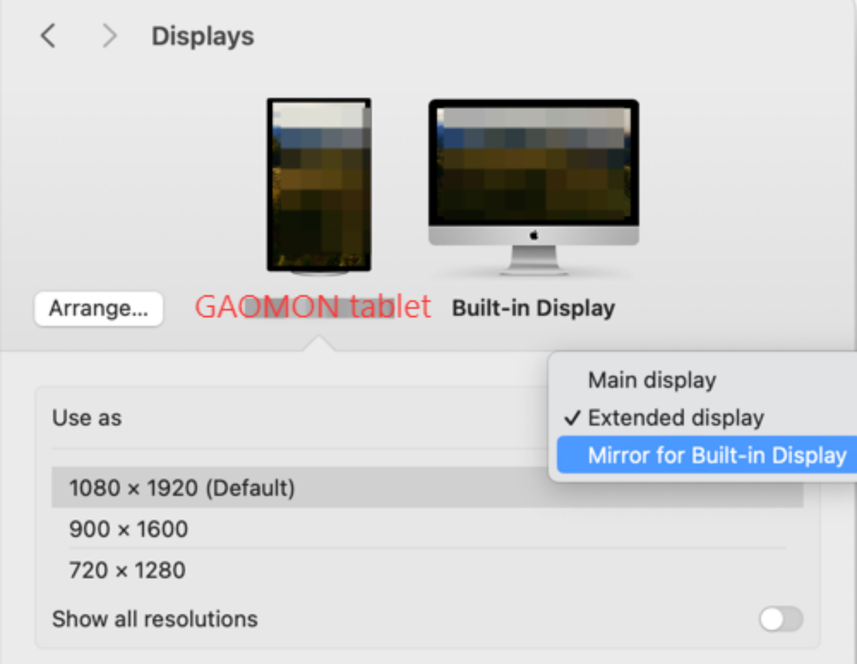 - For Mac: Go to "System Preferences," select "Displays," click on "Arrangement," select the GAOMON tablet, right-click it, and choose "Mirror for Built-in Display."